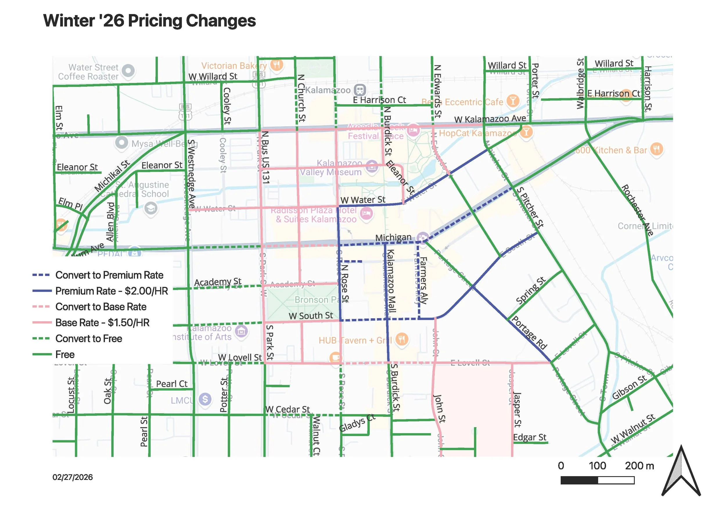 Pricing will change on some streets to go along with free 90-minute parking in the Epic and Kalamazoo Ramps, which was established in 2023, as is called for in Downtown Kalamazoo’s parking plan: Parking+, Strategic Blueprint and Action Plan
